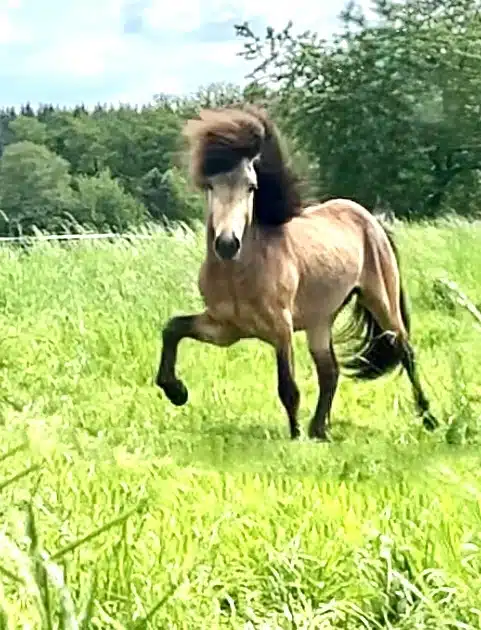 Heljar ist ein leichtfüßiger Fünfgang-Junghengst mit ausdrucksvoller Bewegung und gleichmäßig harmonischer Gangverteilung. Sein Taktgefühl und das natürliche Maß an Tempo machen ihn zu einem auffallend eleganten Youngster mit viel Potenzial.