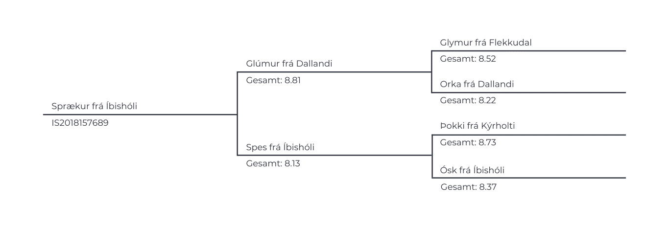 Sprækur ist ein im Typ stehender Islandhengst mit ausdrucksstarkem Erscheinungsbild, gekennzeichnet durch üppige Mähne und Schweif. Er stammt aus einer Linie herausragender Leistungsträger und ist ein talentierter Fünfganghengst mit vielversprechender Bewegungsmechanik, Elastizität und Tempovarianz – Eigenschaften, die auch seinen Vater Glúmur auszeichnen.